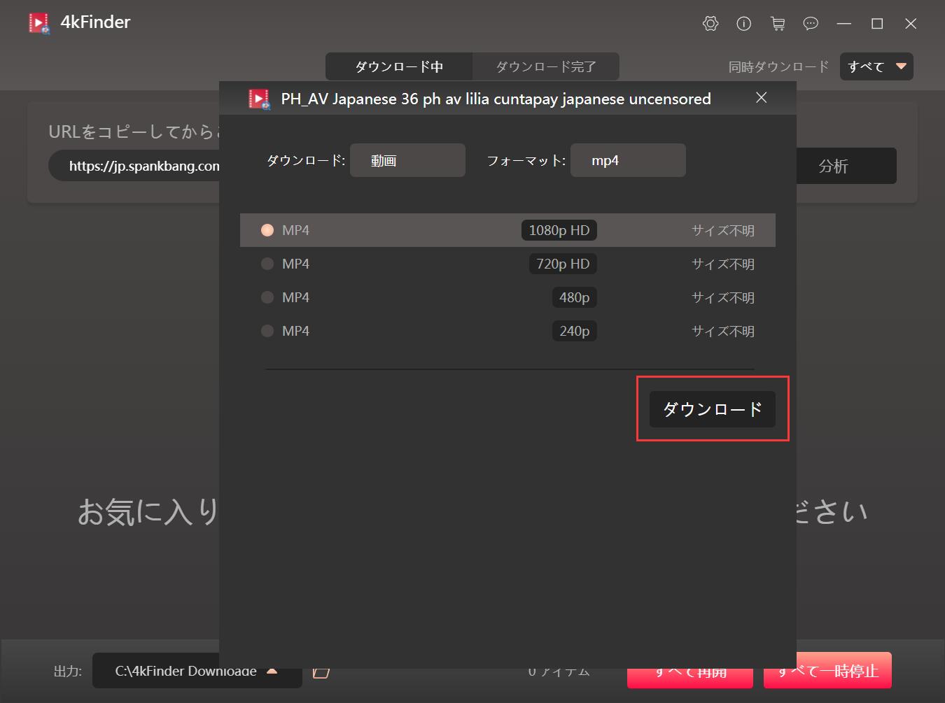 設定後、「ダウンロード」ボタンをタッチして4kFinder SpankBangビデオダウンローダーを使用し、SpankBangからのエロ動画をダウンロードします。