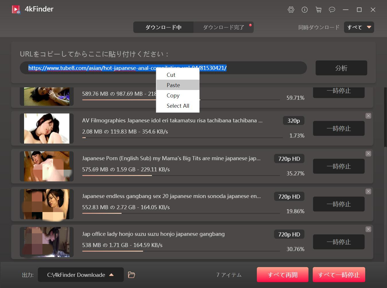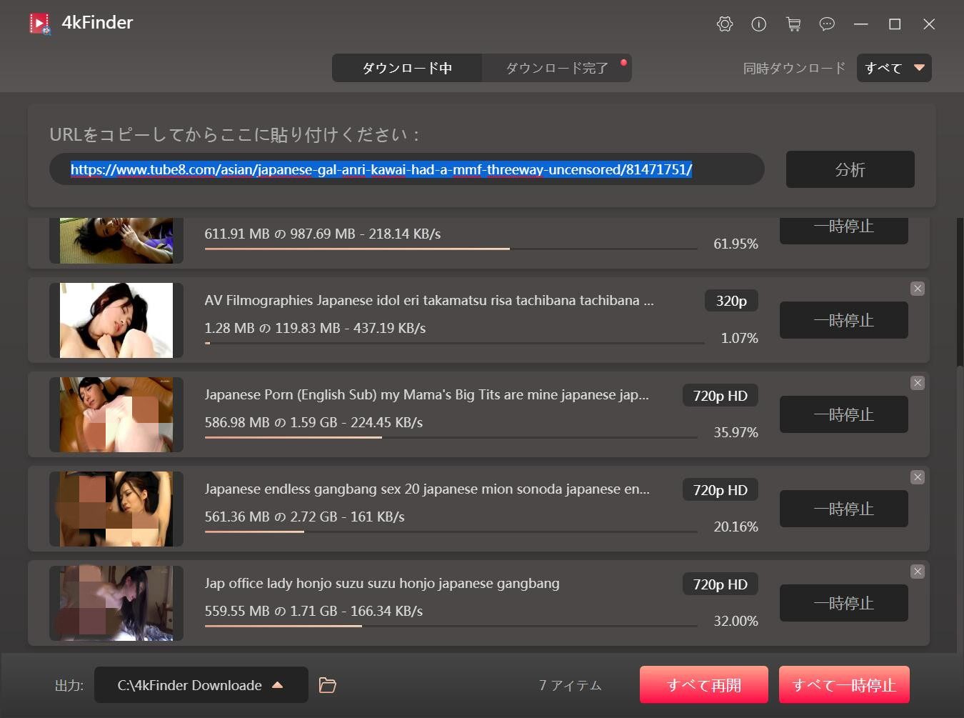 4kFinderビデオダウンローダーを使えば、簡単にTube8動画をMP4にダウンロードできます。このソフトはパソコン用の優秀な無料ビデオダウンローダーです。完璧にTube8動画をダウンロードし、動画品質は720P、1080P、2K、4Kまたは8KなどのMP4形式に変換できます。また、たくさんのビデオサイトへのダウンロードを対応し、xHamster、SpankBang、Pornhub、Xvideos、YouTube、Twitterなど1000の動画サイトから動画をダウンロードできます。多くのサイトダウンロード対応はビデオマニアにとって素晴らしいソフトだと思います。