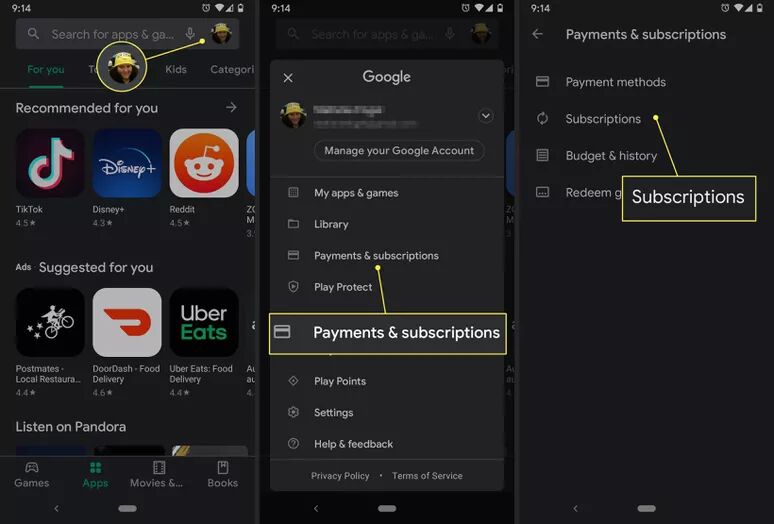 Step 2. Tap on your profile photo in the upper right corner, and select “Payment & Subscriptions” from the menu.