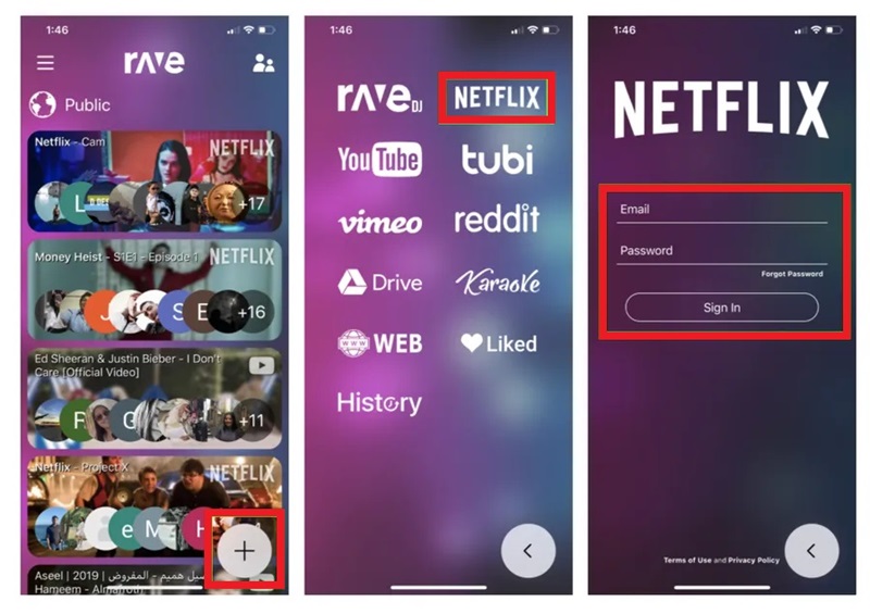 Step 3. Tap the “+” button, select Netflix, and sign in to your account.