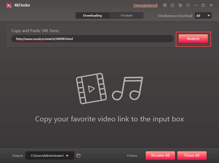 Back to 4kFinder Video Downloader, paste the Nosub video link to the address bar in the center of the interface. Press on “Analyze” tab, the Nosub Videos Downloader will analyze Nosub anime videos automatically.