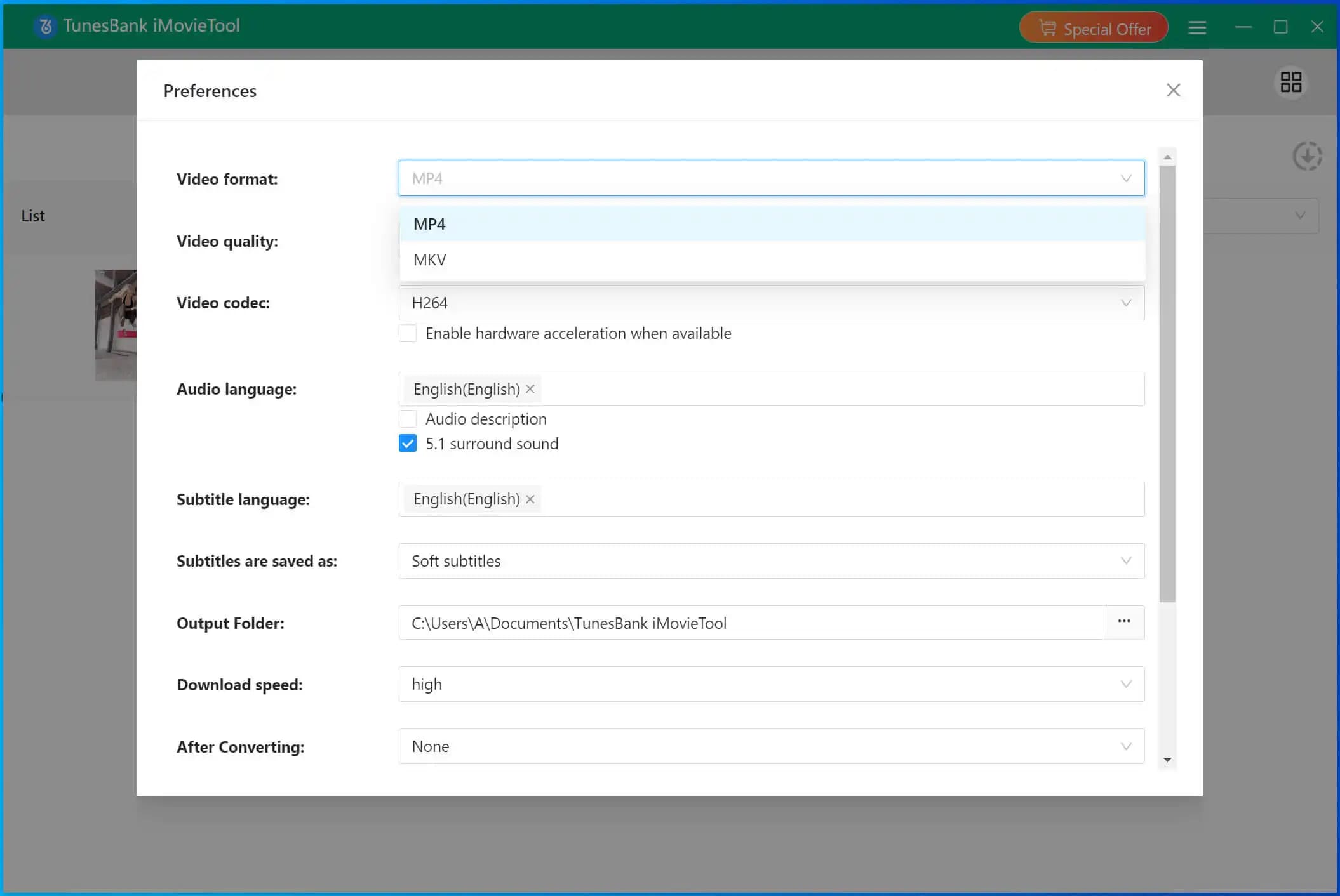 Click the Setting icon and open Preferences. Here you can choose the output format to MP4, video codec, audio language, subtitle language, and more.