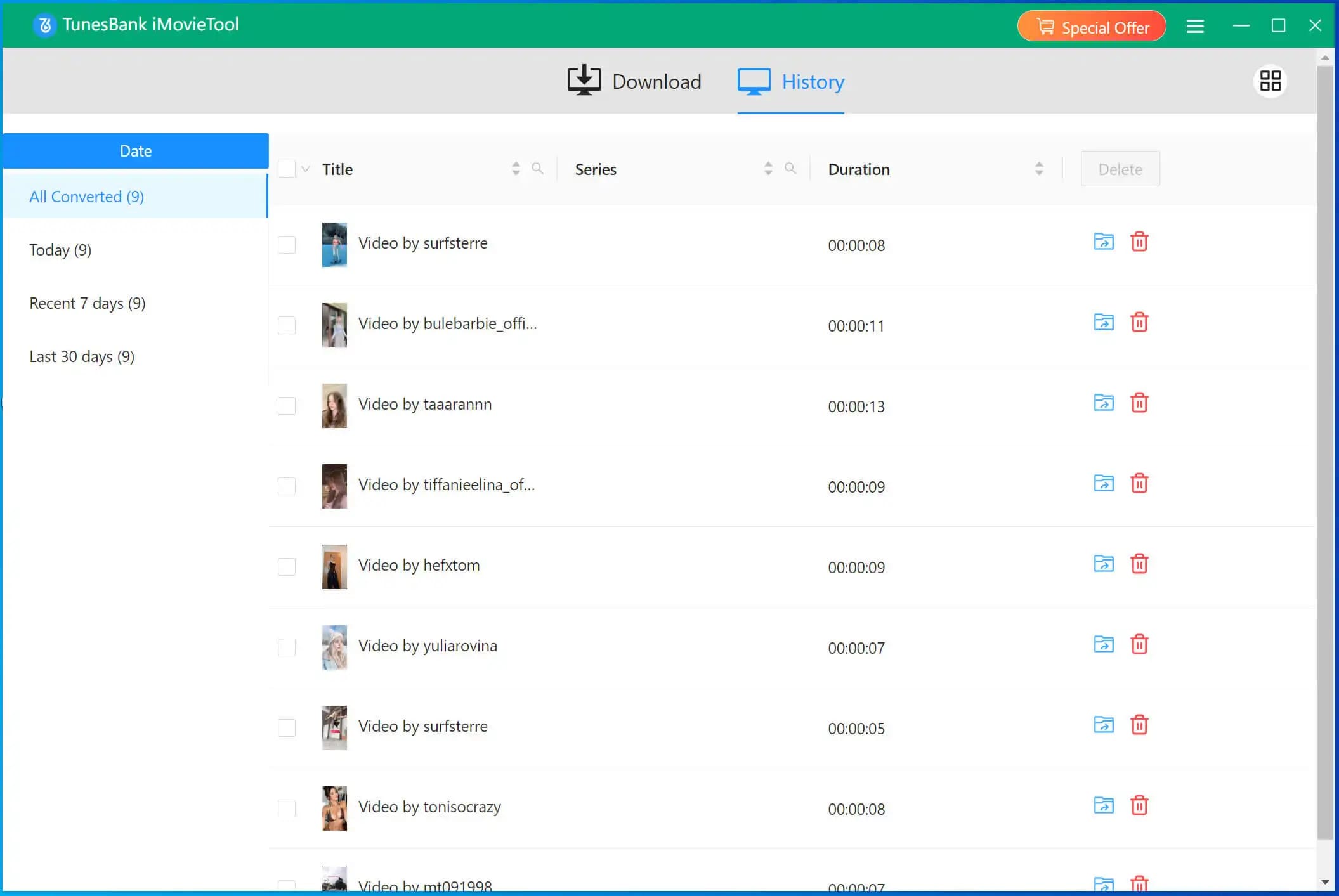 Once your settings are ready, click the Download button next to the video. iMovieTool will start saving the video to your computer.