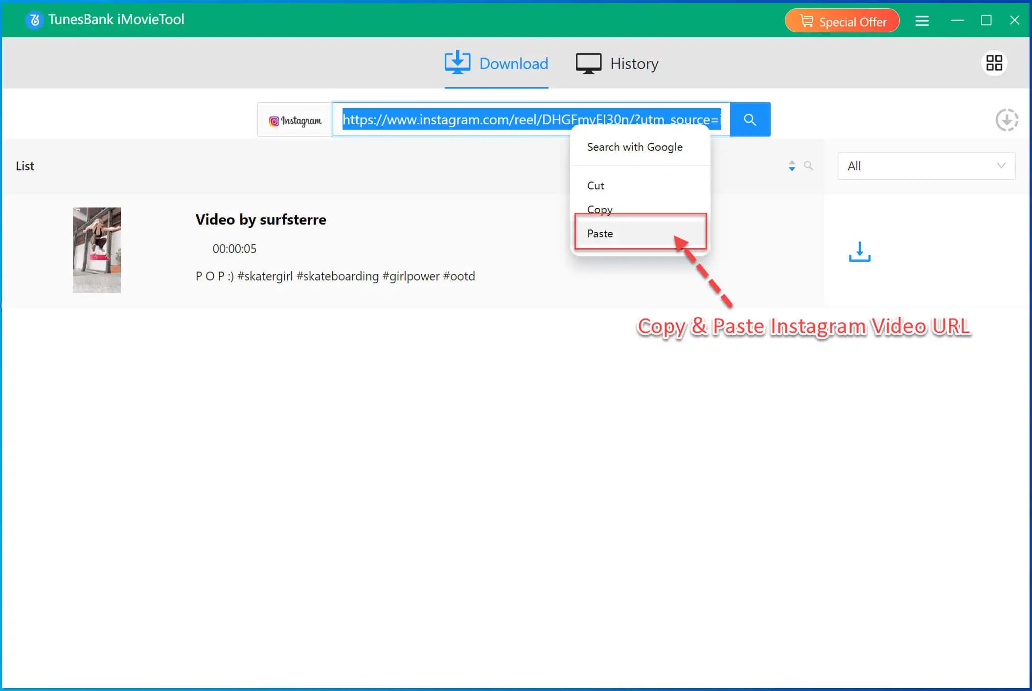 Head over to the Instagram app or website, locate the video you’d like to download, and copy its link. Then, paste the link into the search bar in iMovieTool.