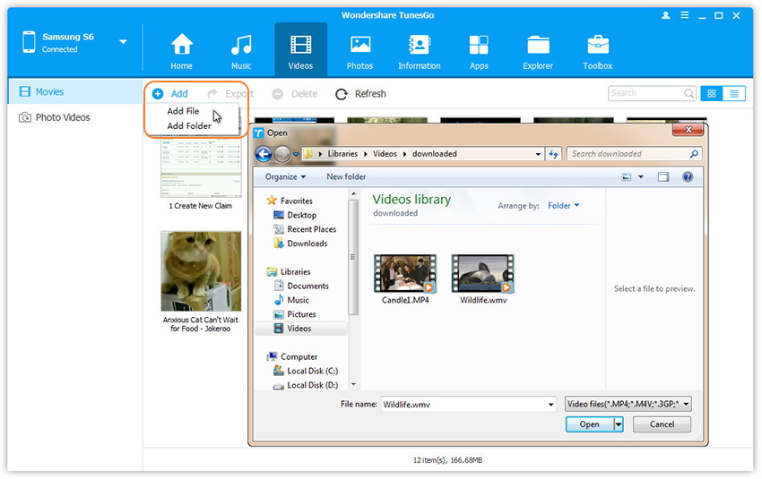 You can also transfer the downloaded Facebook videos to your Android or iOS devices. iOS & Android Manager is a great tool that can help you manage, backup and transfer videos, music, photos, Contacts, SMS, and more on your iOS and Android devices. Just instal and launch iOS & Android Manager on Mac/PC, then connect your iOS/Android device to the computer via USB cable. Click “Videos” > “Add Folder” to transfer the downloaded Facebook video files to your smartphone!