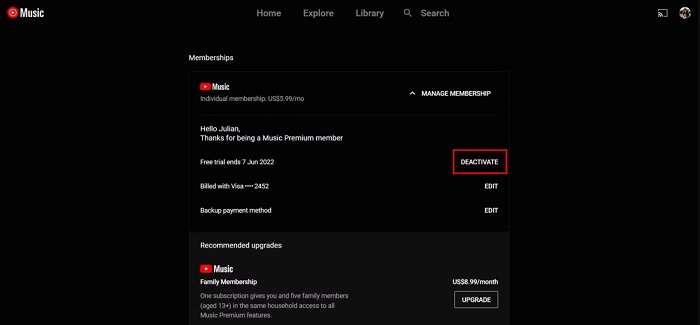 Step 3. Locate the “MANAGE MEMBERSHIP” button next to the details of your YouTube Music subscription. Click on it, then click on the “DEACTIVATE” button next to your next billing date.