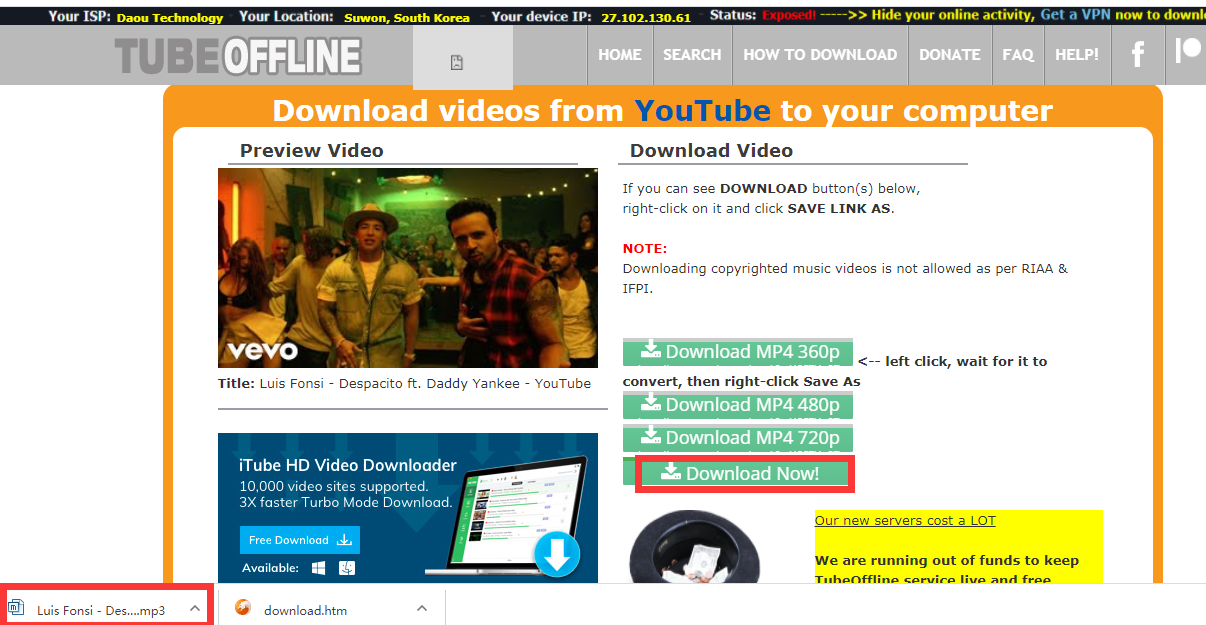If you don’t want to install any software on your Mac, you can also download a YouTube video on Mac via online service. TubeOffline allows you to download video from YouTube to Mac in MP4, AVI, WMV, and other formats. Besides, it also can help you convert YouTube videos to MP3 at 320kbps for your music players. But the annoying thing is that it has a lot of ads, and when you download a YouTube video, it will also take you to another ad page. Here are the simple steps: