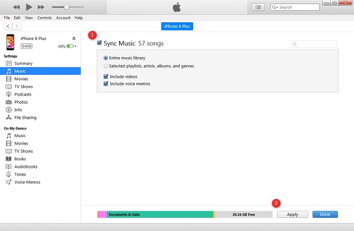 Connect your iPhone to your computer, and in iTunes, select your iPhone located in the upper right corner. From the Menu bar, choose Sync Music < Entire Music Library to synchronize the downloaded YouTube Music MP3 files with your iPhone.